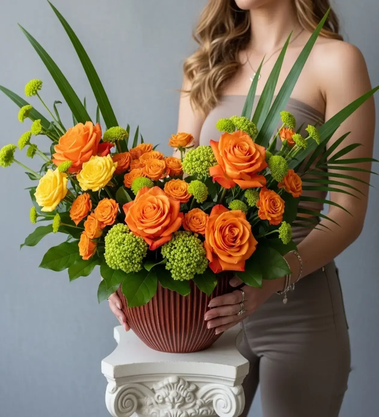 Premium Seramik Vazoda İhtişamlı Turuncu Gül ve Yeşil Krizantem Aranjmanı