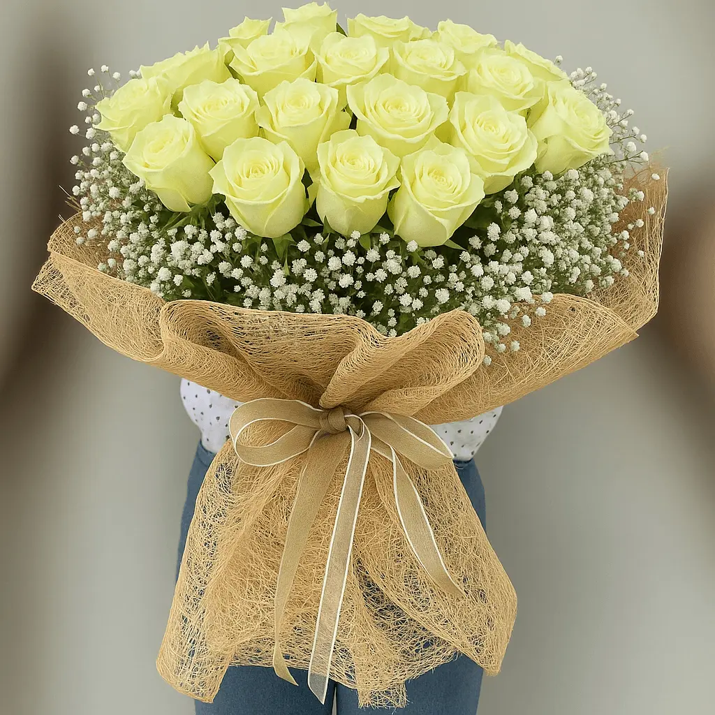 41 adet beyaz gül ile hazırlanan bu göz alıcı buket, saflığın, masumiyetin ve zarafetin simgesidir. Cipso çiçekleri ile zenginleştirilen tasarım, romantik bir jest ya da anlamlı bir kutlama için mükemmel bir seçim sunar.