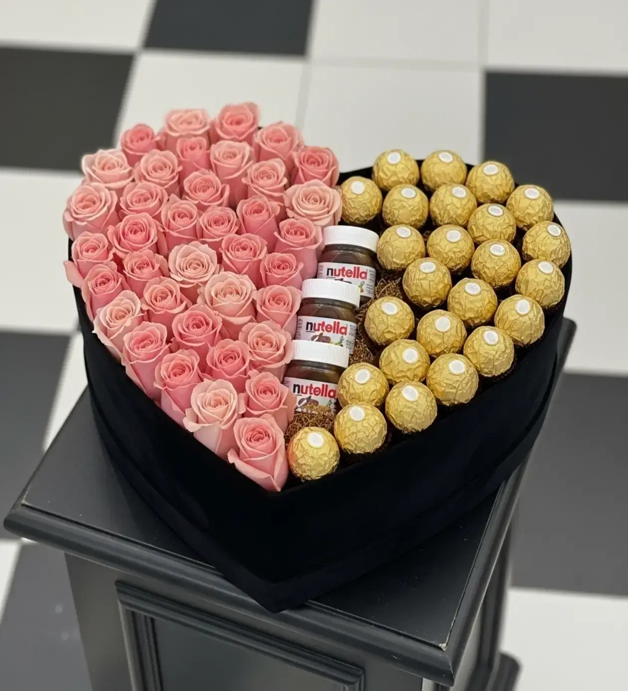 Pembe Aşk – Gül, Ferrero & Nutella Kalp Kutu, zarif pembe güllerin romantizmini, çikolatanın tatlılığıyla buluşturan özel bir tasarım.