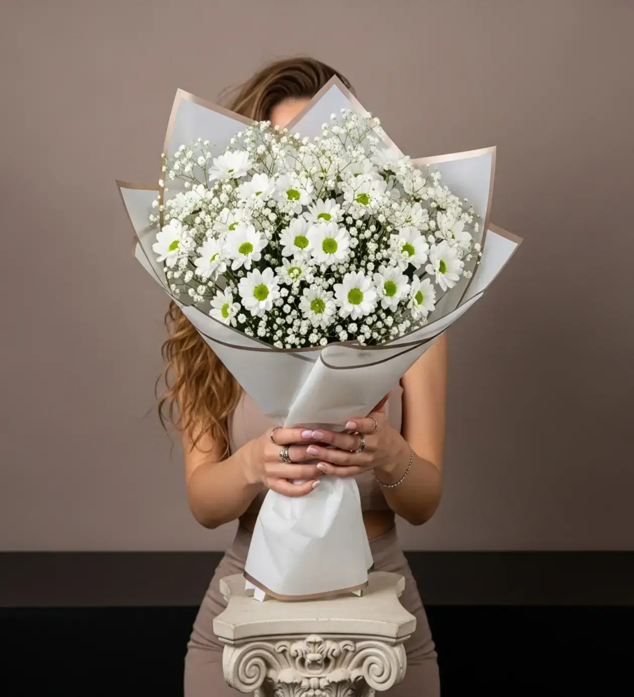 Hacimli Görünüm: Buketin ana karakteri olan taze Beyaz Papatyalar (Krizantem Papatya), aralara serpiştirilen yoğun Cipso (Gypsophila/Gelin Çiçeği) dalları ile desteklenerek "dolu dolu" ve zengin bir form kazanmıştır.
