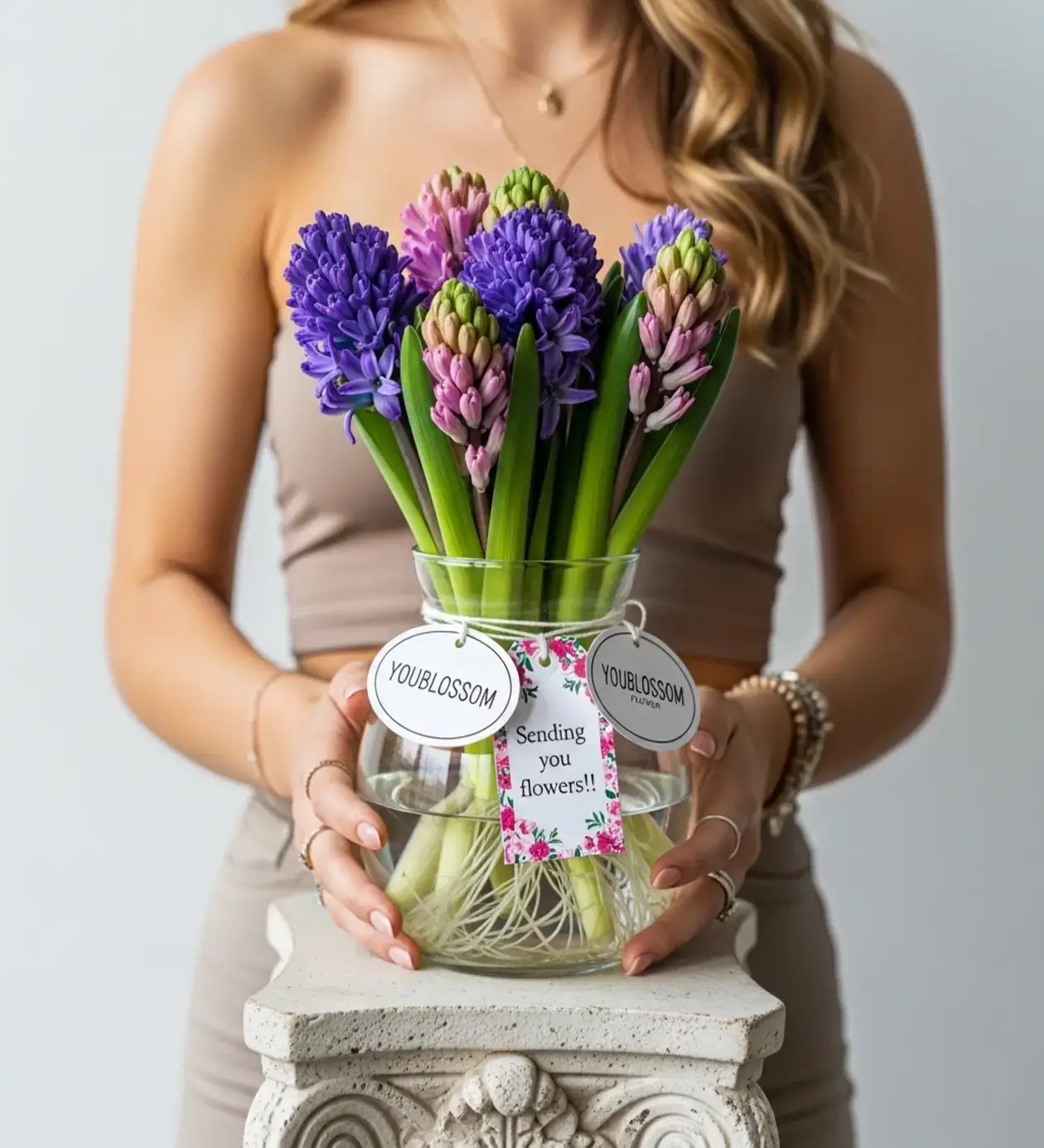 Renklerin Harmonisi ve Minimalist Dokunuşlar Asaleti simgeleyen derin mavi sümbüller ile şefkati temsil eden pastel pembe sümbüller, aranjmana hacim katan yeşil tomurcuklarla kusursuz bir renk harmonisi yakalıyor. Vazonun boynunu saran sade bir ip ve YouBlossom logolu minimal hediye kartları, tasarımın o "topraktan yeni koparılmış" organik ve rustik hissiyatını pekiştiriyor. Doğum günleri, yeni başlangıçlar veya doğallığı seven sevdikleriniz için unutulmaz bir sürpriz seçeneğidir.