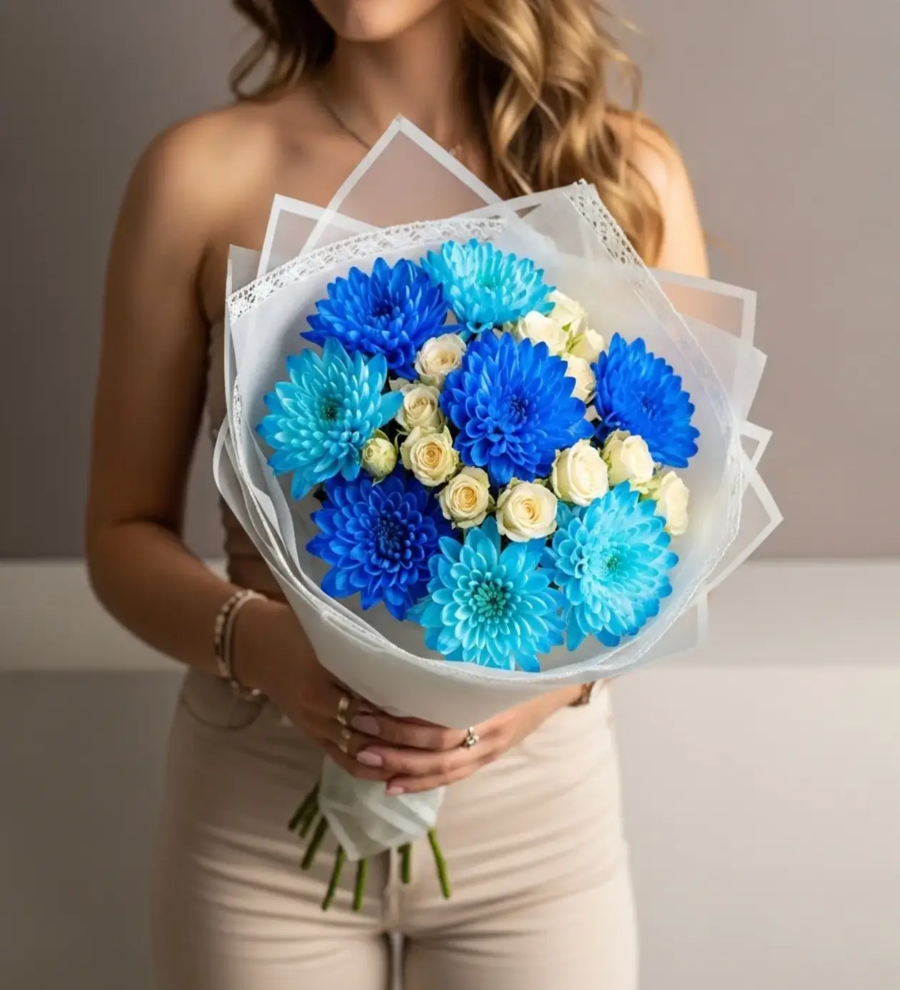 Tasarımcının Notu 💡 "Bu tasarımı hayal ederken gökyüzünün o uçsuz bucaksız maviliği ile bulutların beyazlığından ilham aldık. Mavi krizantemlerin o dolgun ve top top yapısı başlı başına çok dikkat çekici olduğu için, etrafını saran çiçeklerin daha minik formlu olmasını istedik; bu yüzden çardak gülleri tercih ettik. Beyaz ambalaj kullanımıyla da buketin o modern ve 'cool' duruşunu sabitledik."