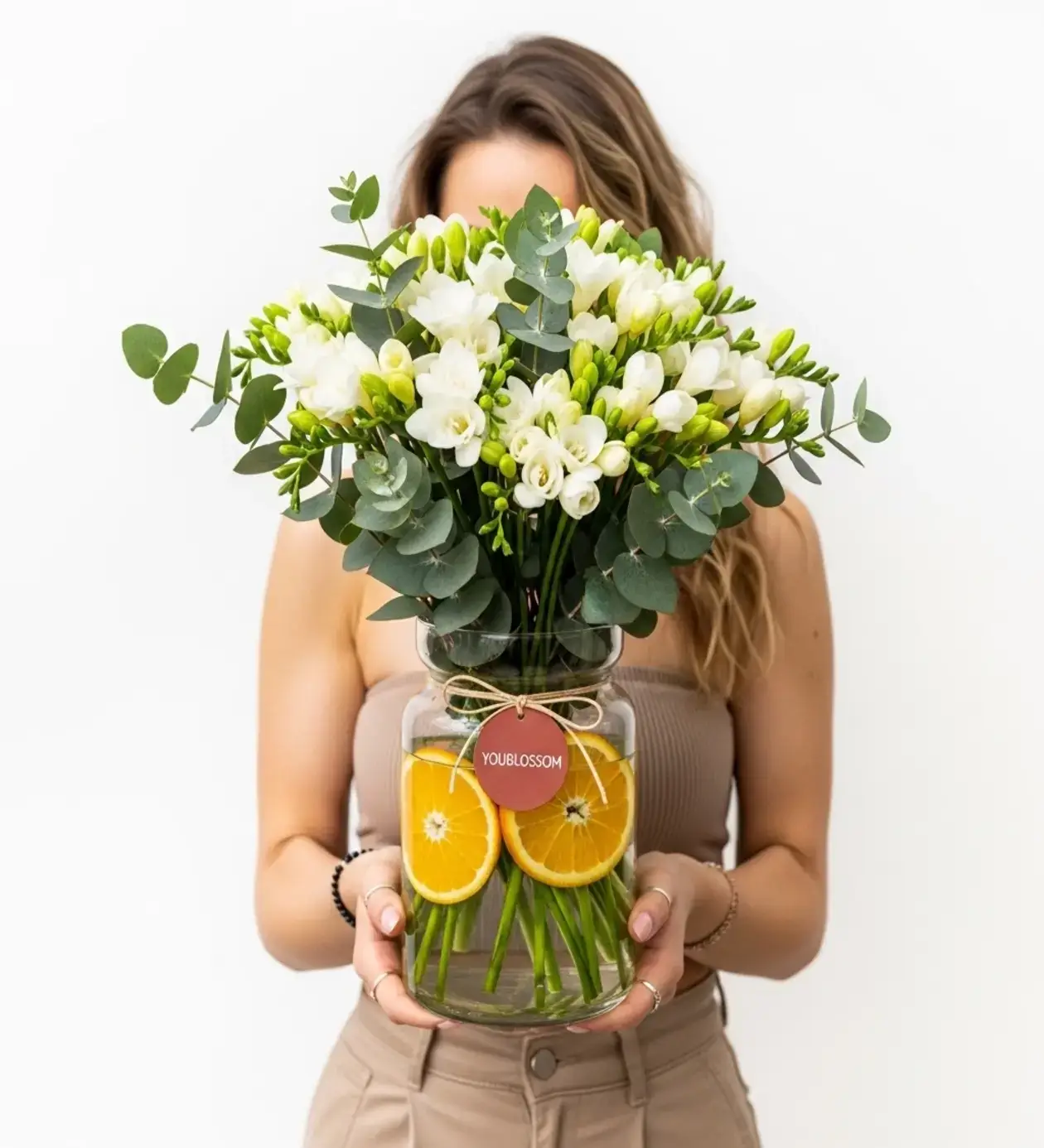 Bu özel tasarımda, açmaya hazır tomurcuklarıyla beyaz frezya çiçekleri ve taze okaliptüs dalları bir araya getirilerek şeffaf cam vazoya yerleştirilir. Tasarımı rakipsiz kılan o "İmza" dokunuş ise, vazo suyunun içine özenle dizilmiş taze portakal dilimleridir. Frezyanın o tatlı bahar kokusu, okaliptüsün ferahlığı ve portakalın narenciye enerjisiyle birleştiğinde, odaya giren herkesi büyüleyecek bir "Aromaterapi" etkisi yaratır.