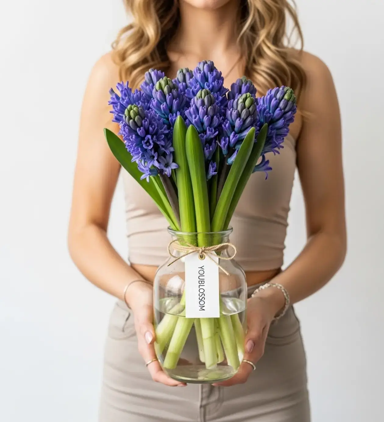 Tasarımcının Notu 💡 "Sümbüller başlı başına çok güçlü karaktere ve kokuya sahip çiçeklerdir. Bu tasarımı hazırlarken, onları gösterişli kağıtlara sarmak yerine, kendi doğal formlarında, suyun içinde ne kadar güzel durduklarını sergilemek istedik. Cam vazonun şeffaflığı ve hasır ipin doğallığı, sümbüllerin o tatlı mavi/mor tonunu kusursuz bir şekilde dengeliyor."