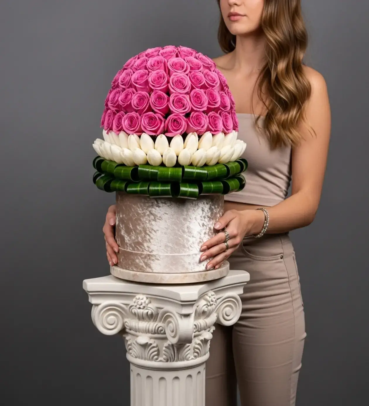 Bu özel aranjman, 60 adet canlı pembe gülün romantik tonlarıyla, 25 beyaz laleden oluşan saf bir çemberi bir araya getirir. Her bir çiçek, sevgiyle seçilmiş ve el işçiliğiyle hazırlanmıştır. Kadife dokulu krem kutu içinde yer alan kompozisyon, hem zarif hem de etkileyici bir görünüm sunar.