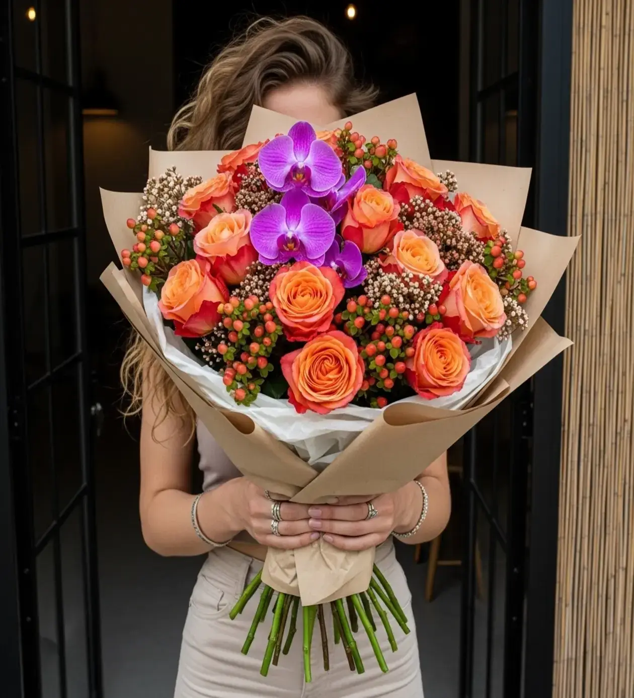 Bu ihtişamlı buketin tabanını, yaşam enerjisini ve coşkuyu temsil eden taptaze turuncu güller ile sevimli hiperikum meyveleri oluşturuyor. Ancak buketi standart bir tasarım olmaktan çıkarıp bir sanat eserine dönüştüren asıl detay; aranjmanın tam kalbinden yükselen o egzotik mor Phalaenopsis orkide kandilleridir. Mor ve turuncunun bu iddialı uyumu, doğal kraft kağıt ve içerisindeki beyaz pelur ambalaj ile sarmalanarak göz yormayan, modern bir "Natürel Lüks" seviyesine ulaşıyor.