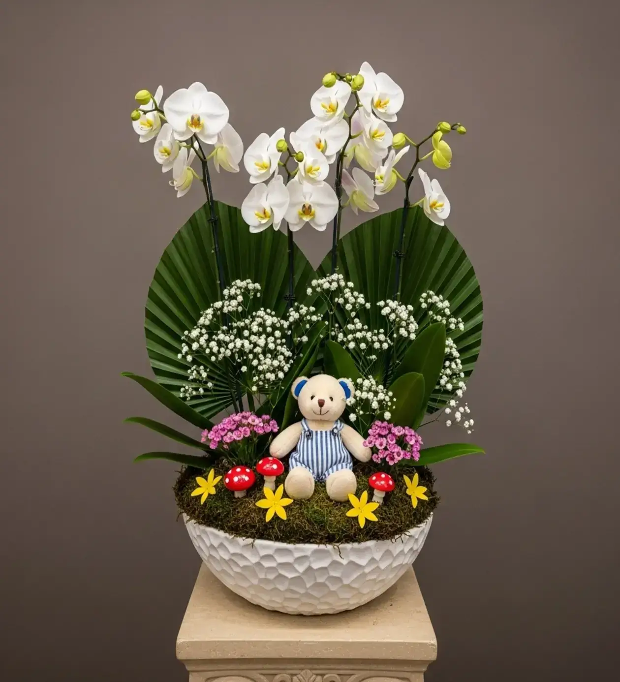 Zarafetin simgesi beyaz orkideler yükselirken, altındaki yosun kaplı zeminde sizi karşılayan sevimli peluş ayıcık ve kırmızı mantarlar, tasarımı adeta fantastik bir orman sahnesine dönüştürüyor. Arkadaki dekoratif palmiye yaprağı ise bu mini bahçeye derinlik katıyor. İlişkinizdeki neşeyi ve masumiyeti anlatmanın en tatlı yolu!
