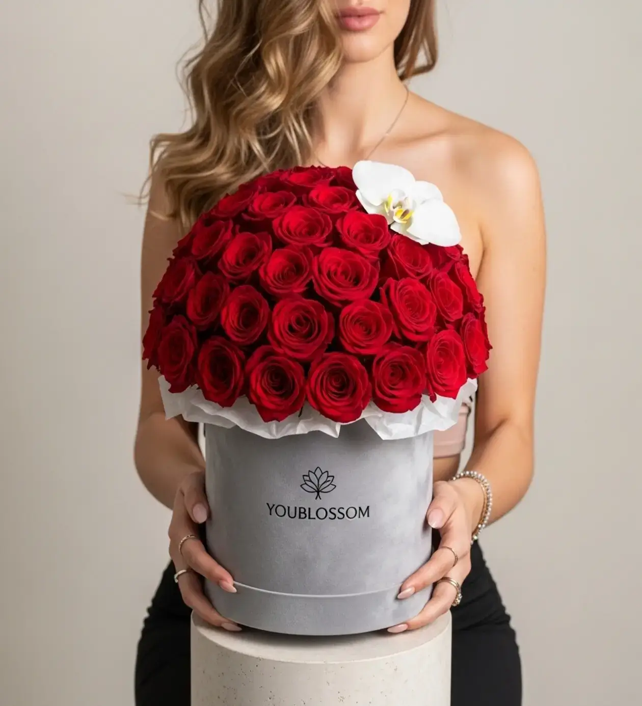 YouBlossom tasarımcıları, bu özel kutuda kırmızı güllerin enerjisini gri rengin sakinliğiyle dengeledi. Tasarımın zirvesine yerleştirilen tek beyaz orkide, sevgilinizin sizin için ne kadar "biricik ve özel" olduğunu fısıldıyor. Ofis masasında, salonda veya yatak ucunda... Bu kutu girdiği her ortamın havasını değiştirecek bir dekorasyon objesidir.