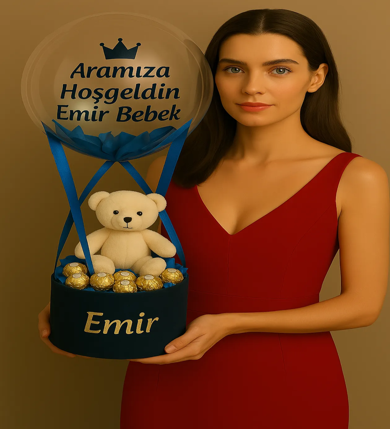 Yeni bir hayatın sevincini en zarif haliyle kutlayın! "Aramıza Hoşgeldin Emir Bebek" yazılı balonla tamamlanan bu özel kutu, yeni doğan erkek bebekler için hem şık hem de duygusal bir hediye seçeneğidir.