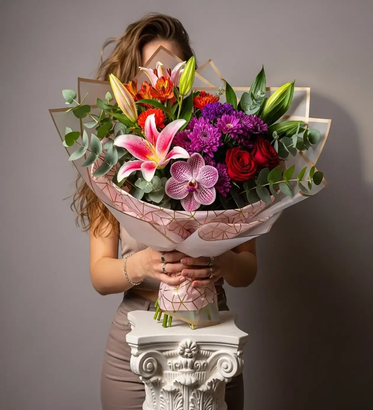 Buketin kalbinde yer alan pembe oryantal lilyumlar ortama mis gibi bir koku yayarken, aşkın simgesi kırmızı güller tutkuyu temsil ediyor. Aralara serpiştirilen mor krizantemler ve egzotik görünümüyle dikkat çeken benekli Vanda orkidesi, tasarıma modern ve sofistike bir hava katıyor. Turuncu alstromeryaların enerjisi ise bukete neşe veriyor.