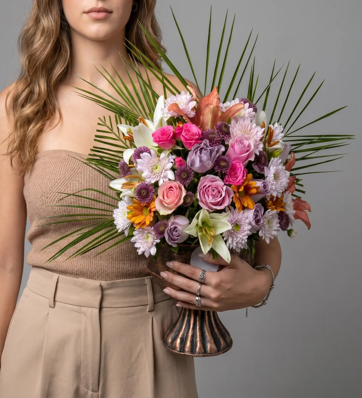 Asil Dokunuşlar: Mis kokulu beyaz lilyumlar ve hacimli krizantemler, renk cümbüşünü asaletle dengeler. Egzotik palmiye yaprakları ise tasarıma geniş, kucaklayıcı ve heykelsi bir form kazandırır.