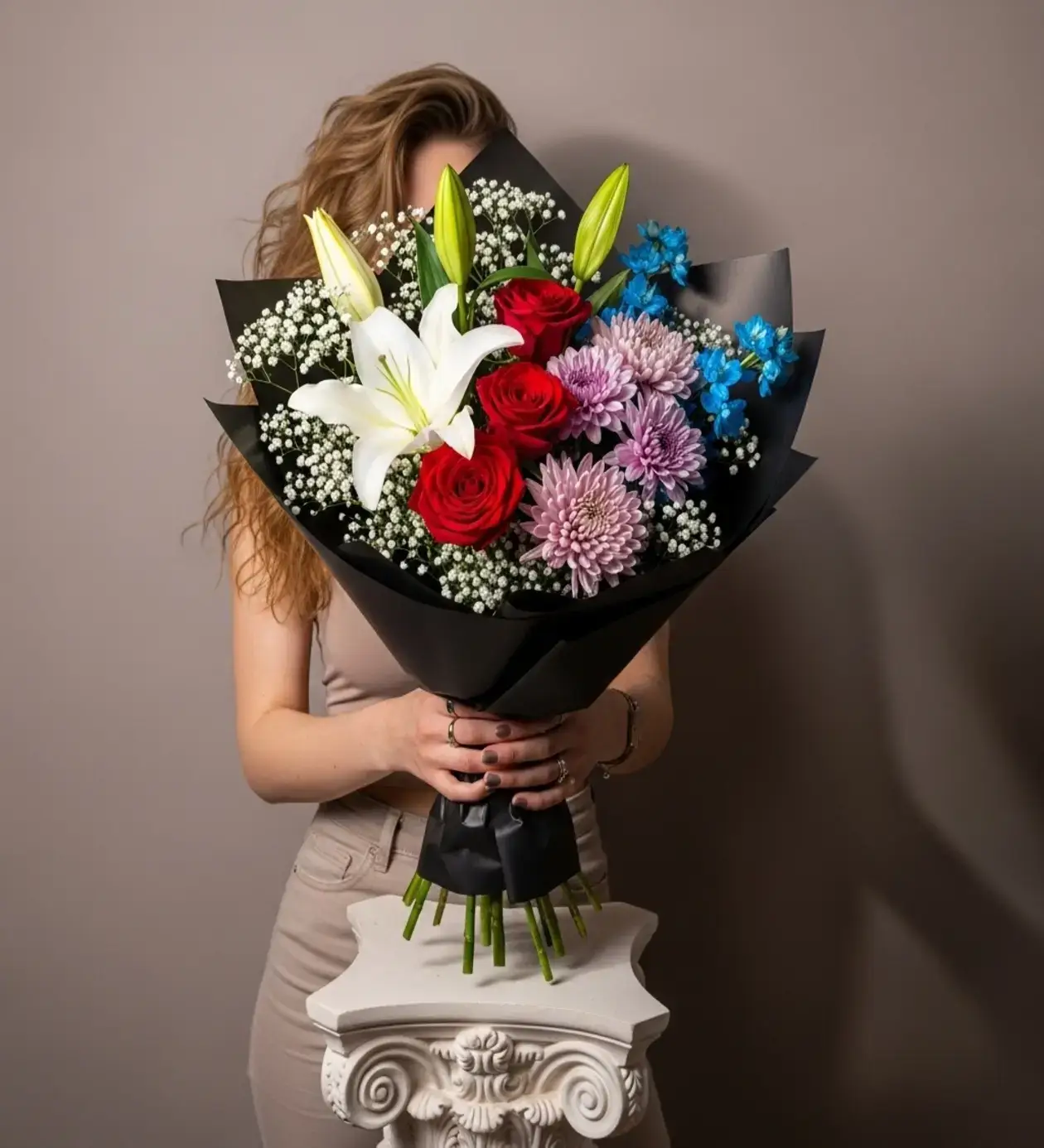 Bu tasarımda, mat siyah ambalajın oluşturduğu koyu fon üzerinde, çiçeklerin renkleri adeta bir havai fişek gibi parlıyor. Beyaz lilyumların zarafeti, kırmızı güllerin tutkusu ve lila krizantemlerin enerjisi, siyahın asil duruşuyla birleşerek ortaya inanılmaz derecede şık ve karizmatik bir buket çıkarıyor.