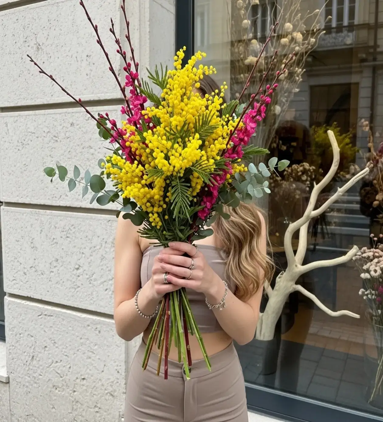 Mimosa Magic, bu tarihi ve anlamlı geleneği en doğal haliyle size sunuyor. Parlak sarı mimoza dalları, baharın müjdecisi fuşya renkli tomurcuklu dallar ve okaliptüs yapraklarıyla harmanlandı. Gösterişli ve yapay ambalajlar yerine, çiçeklerin kendi güzelliğini sergilemesi için "doğal sap bağlamalı" (Naked Stem) rustik bir tarz tercih edildi. Kucağa alındığı an etrafa yayılan o eşsiz pudramsı koku, sevdiklerinize unutulmaz bir bahar enerjisi verecek.