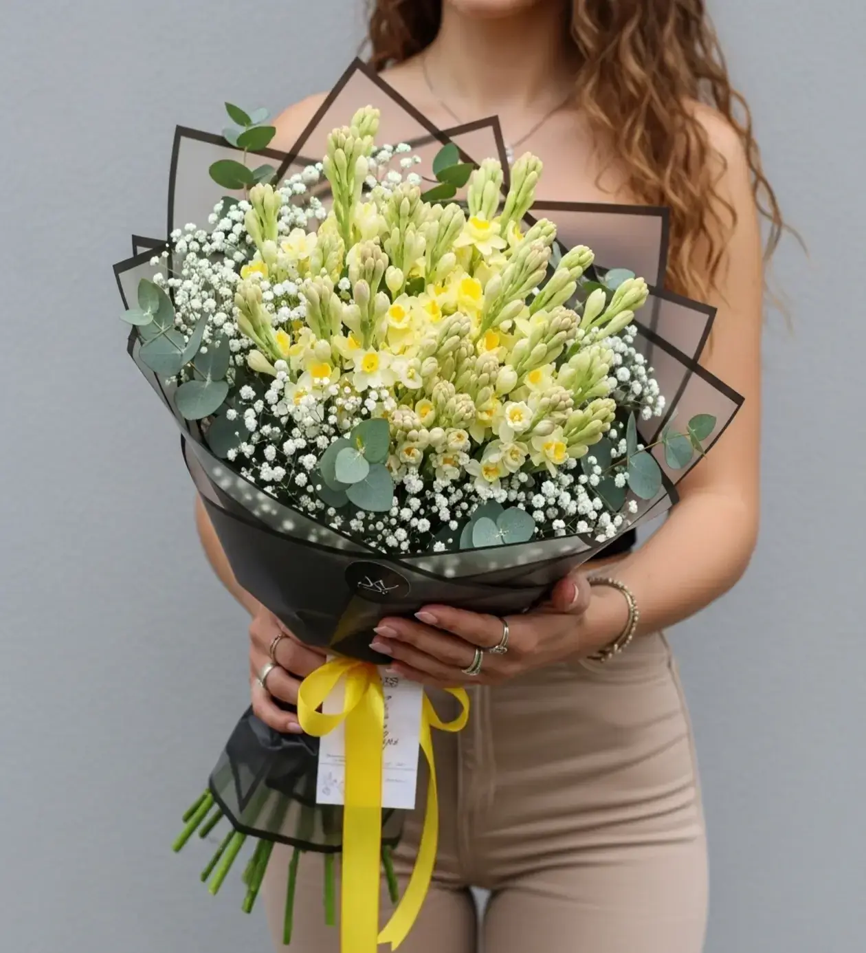 Siyah modern ambalajın içinden; ince zarif saplarıyla sarı beyaz nergis çiçekleri, etrafını saran bembeyaz cipso bulutları ve okaliptus yaprakları yükseliyor. Alt kısımdaki sarı kurdele detayı hem nergisin rengiyle uyum sağlıyor hem de bukete pozitif enerji katıyor. Sonuç: Hem çok şık hem çok hafif, bakınca “mis gibi bahar koktu” dedirten bir nergis buketi.