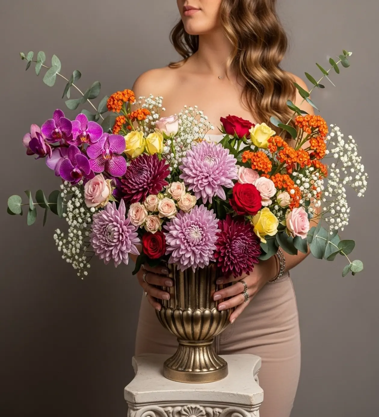 Mor orkidenin asil duruşu, bordo ve lila kasımpatının zarif dokusu ve güllerin romantik diliyle hazırlanmış bu tasarım; özel günlerde seçkin ve unutulmaz bir hediye vermek isteyenler için mükemmel bir tercihtir.