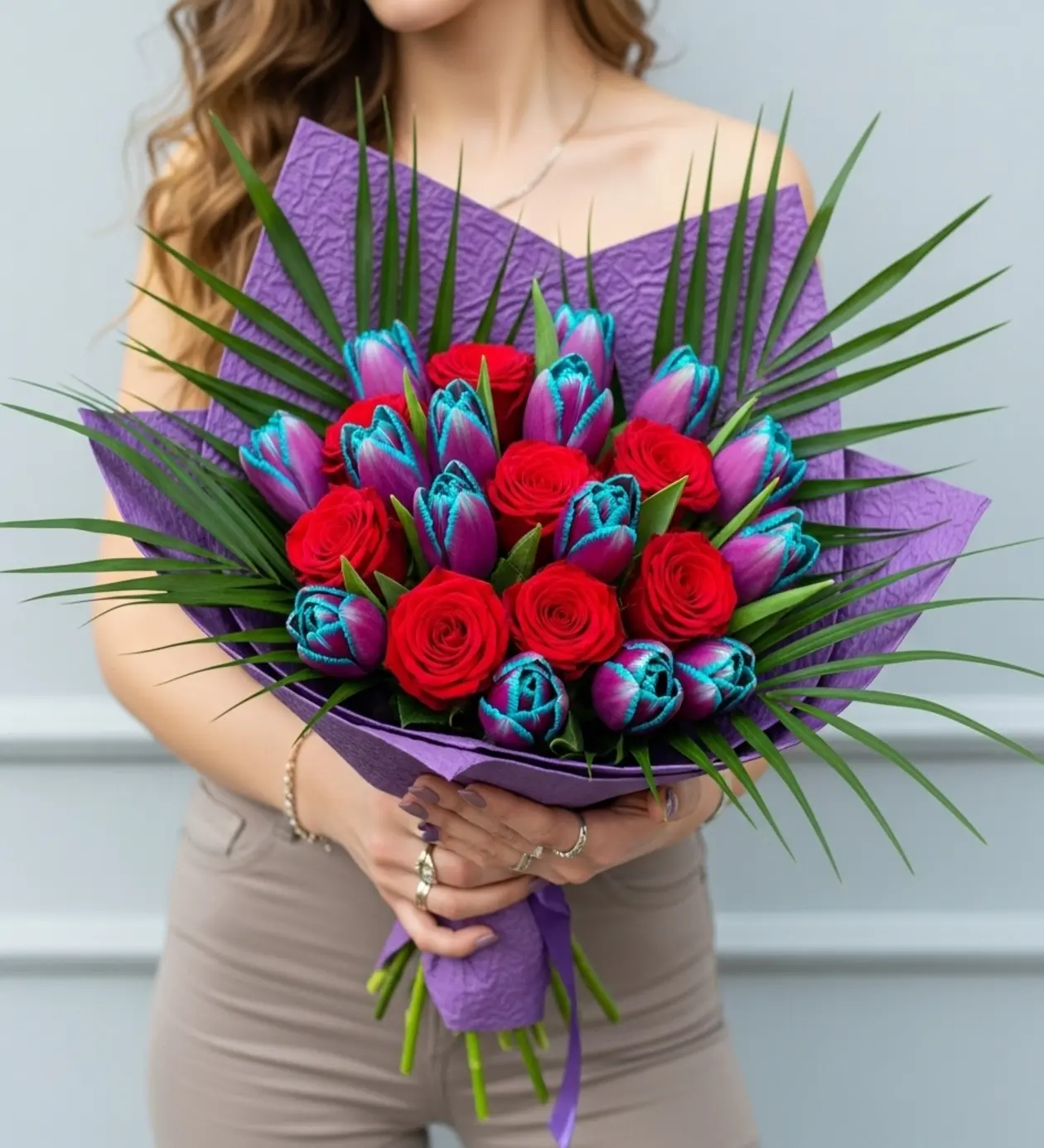 Mor-mavi geçişli ithal laleler, yoğun duyguları simgeleyen kırmızı güllerle birleşerek göz alıcı bir kontrast oluşturur.