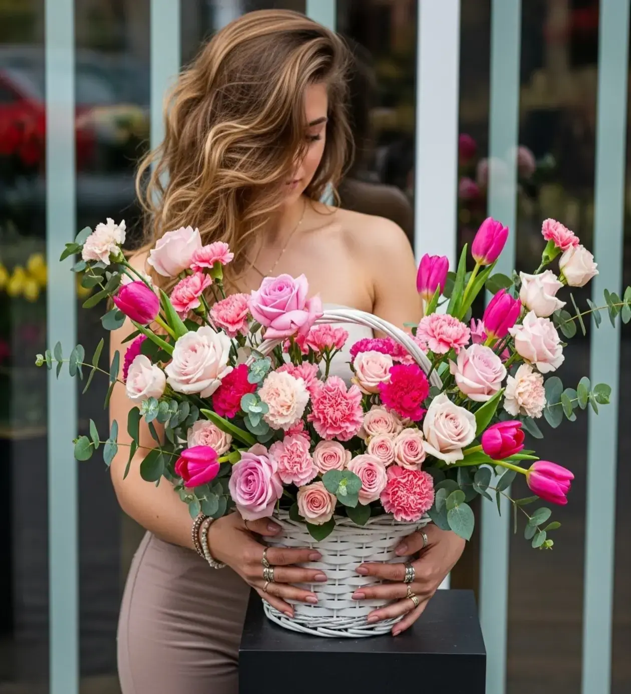 Tasarımda kullanılan yumuşak pembe güller zarafeti, enerjik fuşya laleler mutluluğu, dayanıklı pembe karanfiller ise içten sevgiyi temsil eder. Sepet içerisindeki özel çiçek süngeri sayesinde çiçekleriniz, vazo arama derdi olmadan, suyunu kendi haznesinden alarak günlerce taze kalır.