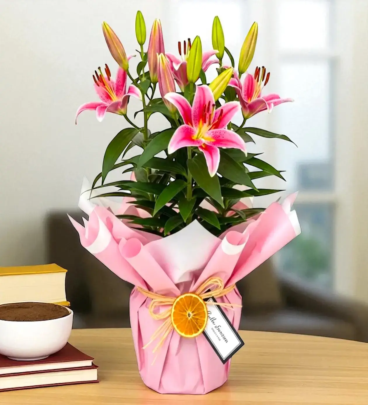 Doğallığı ve zarafetiyle göz kamaştıran Pembe Zambak Saksı Çiçeği, hem dekoratif hem de duygusal anlam taşıyan kalıcı bir hediye alternatifi sunar. Açmış çiçekleriyle dikkat çeken bu özel bitki, koyu renkli beneklerle süslenmiş canlı pembe taç yapraklara ve iç kısımlarında turuncu-kırmızı erkek organlara sahiptir. Henüz açmamış tomurcuklar, çiçeğin gelişimini sürdürdüğünü gösterir.