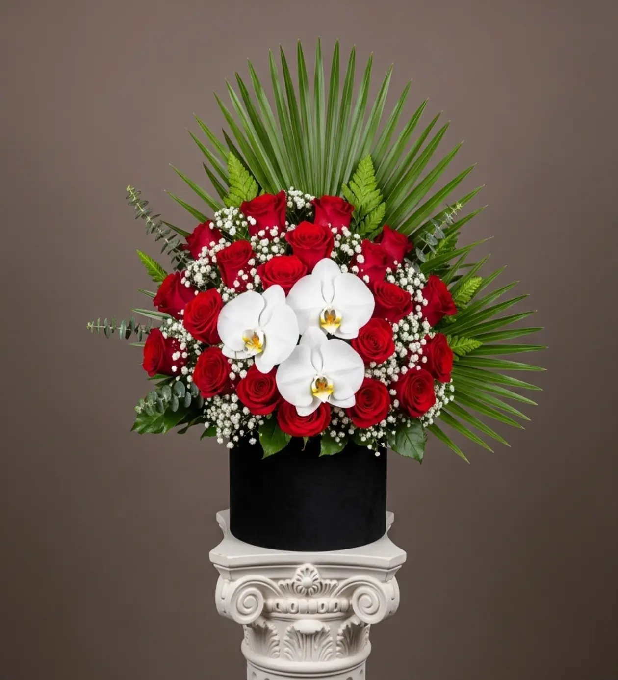 Özenli Tasarım ve Doğal İhtişam YouBlossom çiçek tasarımcıları tarafından ince bir el işçiliğiyle hazırlanan bu aranjman, sadece bir hediye değil, aynı zamanda görsel bir şölendir. Arka planda kullanılan gösterişli yelpaze palmiye yaprakları ve taze okaliptüs dalları, aranjmana modern ve egzotik bir hacim katar. Kırmızı ve beyazın o güçlü ve keskin kontrastı ise aralara serpiştirilen zarif cipsofilalar (bebek nefesi) ile kusursuz bir şekilde yumuşatılır. Yıl dönümleri, Sevgililer Günü, özür dileme anları veya sıradan bir günü unutulmaz kılmak istediğiniz her an için mükemmel bir tercihtir.