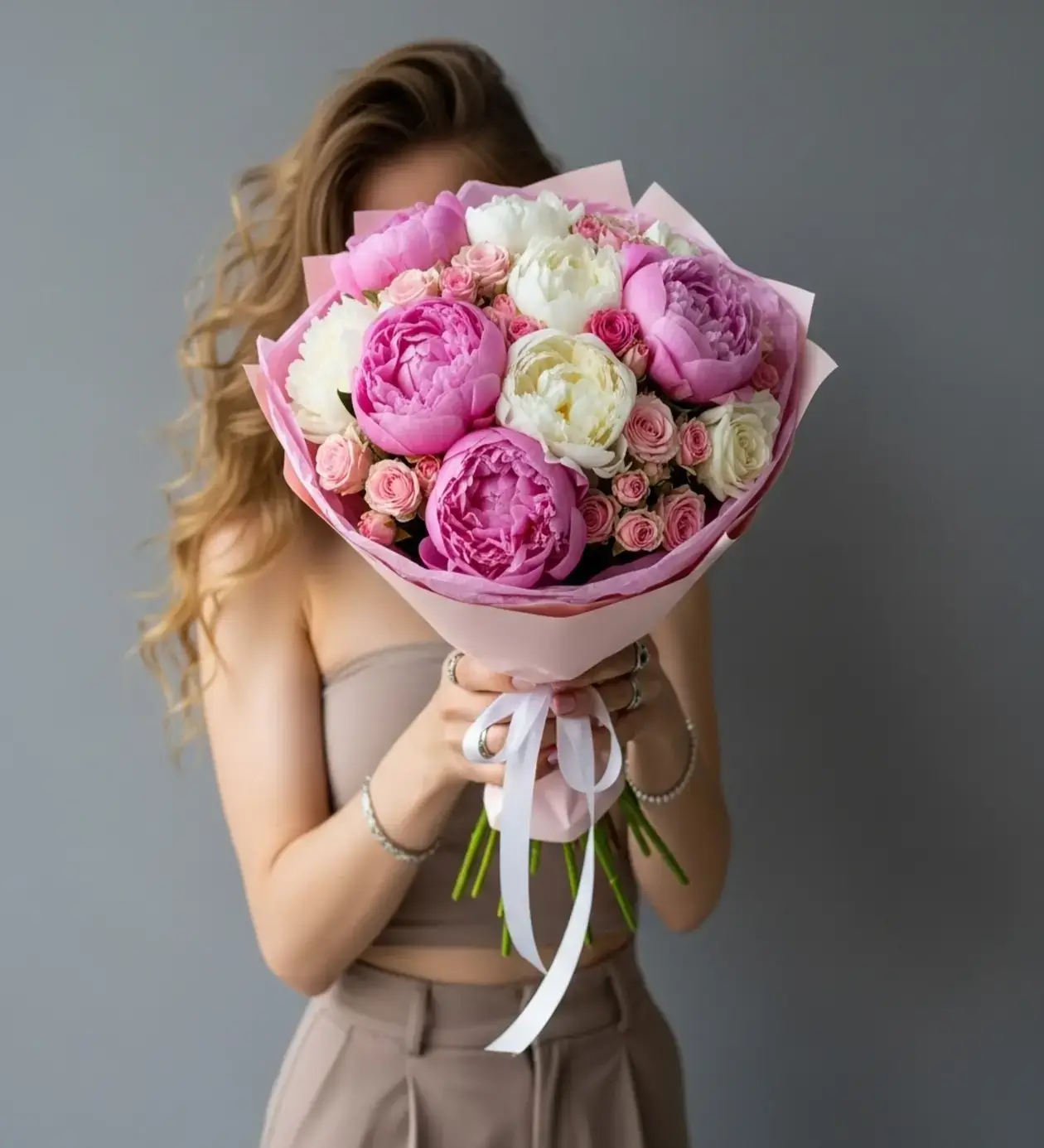 Tasarım Detayları Bu premium tasarımda, mevsimin en gözde çiçeği olan dolgun Pembe Şakayıklar ve asil Beyaz Şakayıklar başrolde. Onlara eşlik eden zarif Çardak Güller, bukete hareket ve romantik bir doku katıyor. Çiçeklerin doğal güzelliğini gölgelemeyen, yumuşak pembe tonlarında lüks ambalaj kağıdı ve beyaz saten kurdele ile hazırlanan bu el buketi, zarafetiyle büyülüyor.