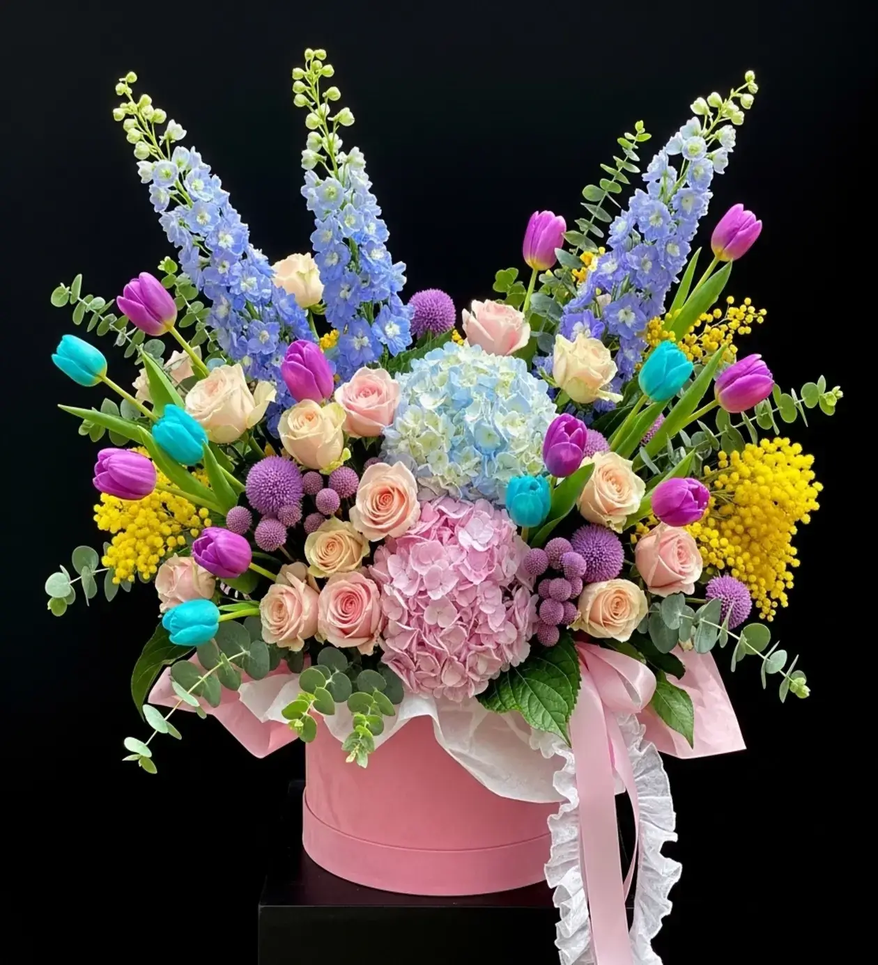 Pudra pembesi şık bir kutunun içinden taşan bu tasarımda adeta bir "Bahar Senfonisi" var. Gökyüzüne uzanan görkemli mavi delphiniumlar, dolgun pembe ve mavi ortancalarla buluşuyor. Tasarıma inanılmaz bir dinamizm katan turkuaz ve mor laleler, neşenin simgesi sarı mimozalar ile dengelenerek iftar masalarınızın veya bayram ziyaretlerinizin yıldızı olmaya aday bir başyapıt yaratıyor.