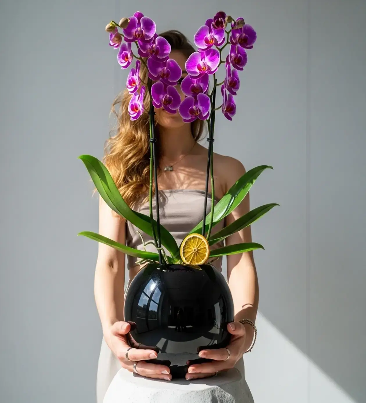 Çiçeklerin aristokratı olarak bilinen orkide, Royal Velvet tasarımımızda siyahın modernliğiyle buluştu. Sıradan şeffaf plastik saksıların aksine, bu ürün için özel olarak seçtiğimiz siyah seramik küre vazo, orkidenin mor çiçeklerini bir sanat eseri gibi ön plana çıkarıyor.
