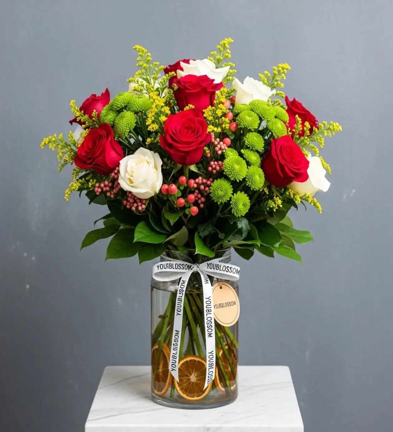 Şeffaflığın ve Narenciyenin Kusursuz Uyumu Bu aranjmanı sıradan bir gül buketinden ayıran en çarpıcı detay, şeffaf cam vazonun içerisindeki o yaratıcı dokunuştur. Suyla bütünleşen portakal dilimleri, klasik güllerin asaletine sıcak, bohem ve narenciye esintili bir modernizm katıyor. Vazonun boynunu saran YouBlossom imza şeridi ve şık yuvarlak etiketiyle tamamlanan bu tasarım, aşkınızı en doğal, içten ve premium haliyle ifade etmeniz için ustalıkla hazırlandı.
