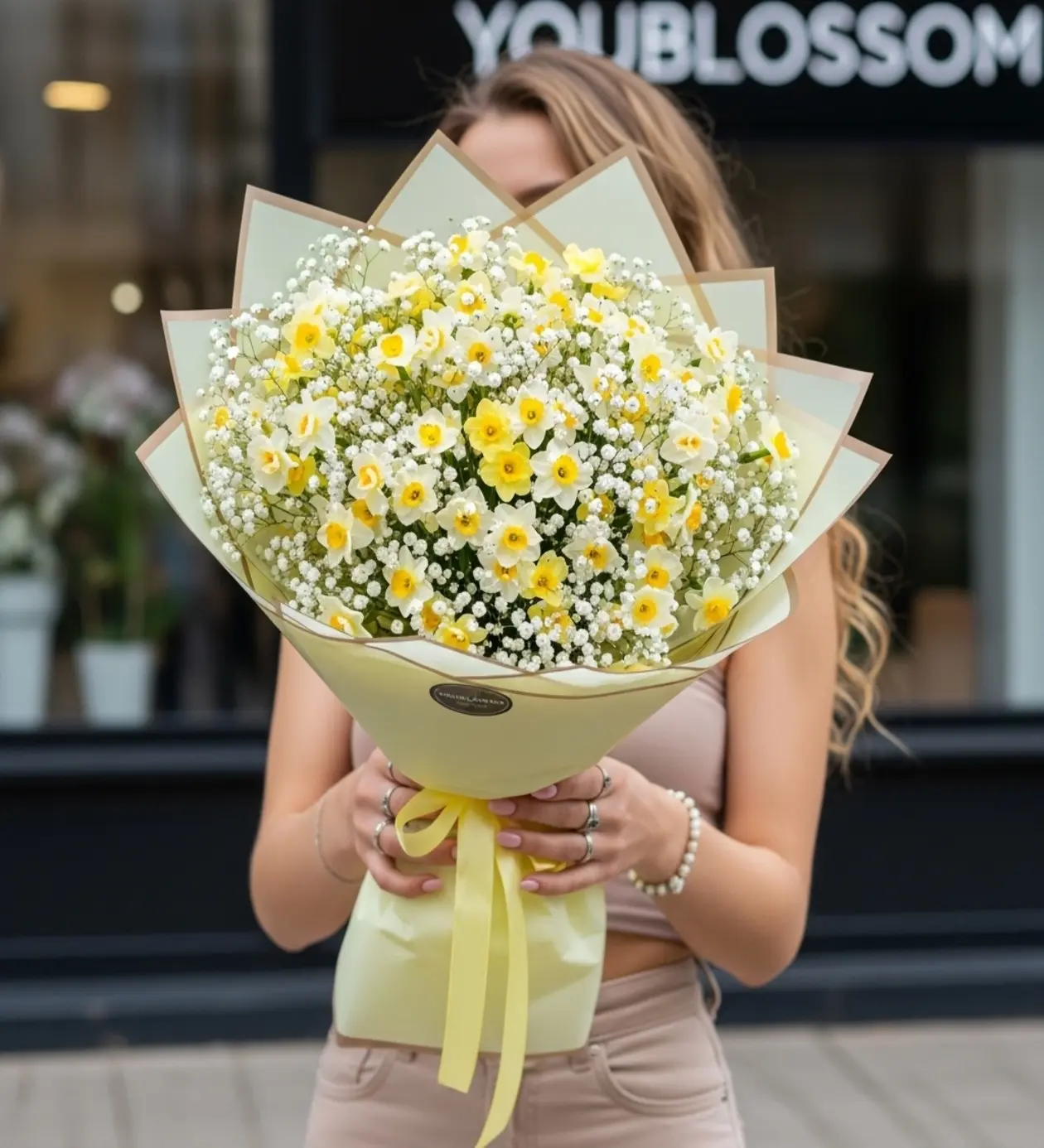 Tasarım Detayları Bu neşe dolu buketin merkezinde, baharın müjdecisi olan canlı Sarı Nergisler yer alıyor. Nergislerin parlak rengini dengelemek ve bukete hacim kazandırmak için, aralara kar tanesi gibi serpiştirilen Beyaz Cipsolar (Gelin Çiçeği) kullanıldı. Tasarımın enerjisini kesmemek adına, çiçeklerle aynı tonda pastel sarı lüks ambalaj kağıdı ve sarı saten kurdele tercih edilerek, baştan sona bir "Güneş" konsepti oluşturuldu.