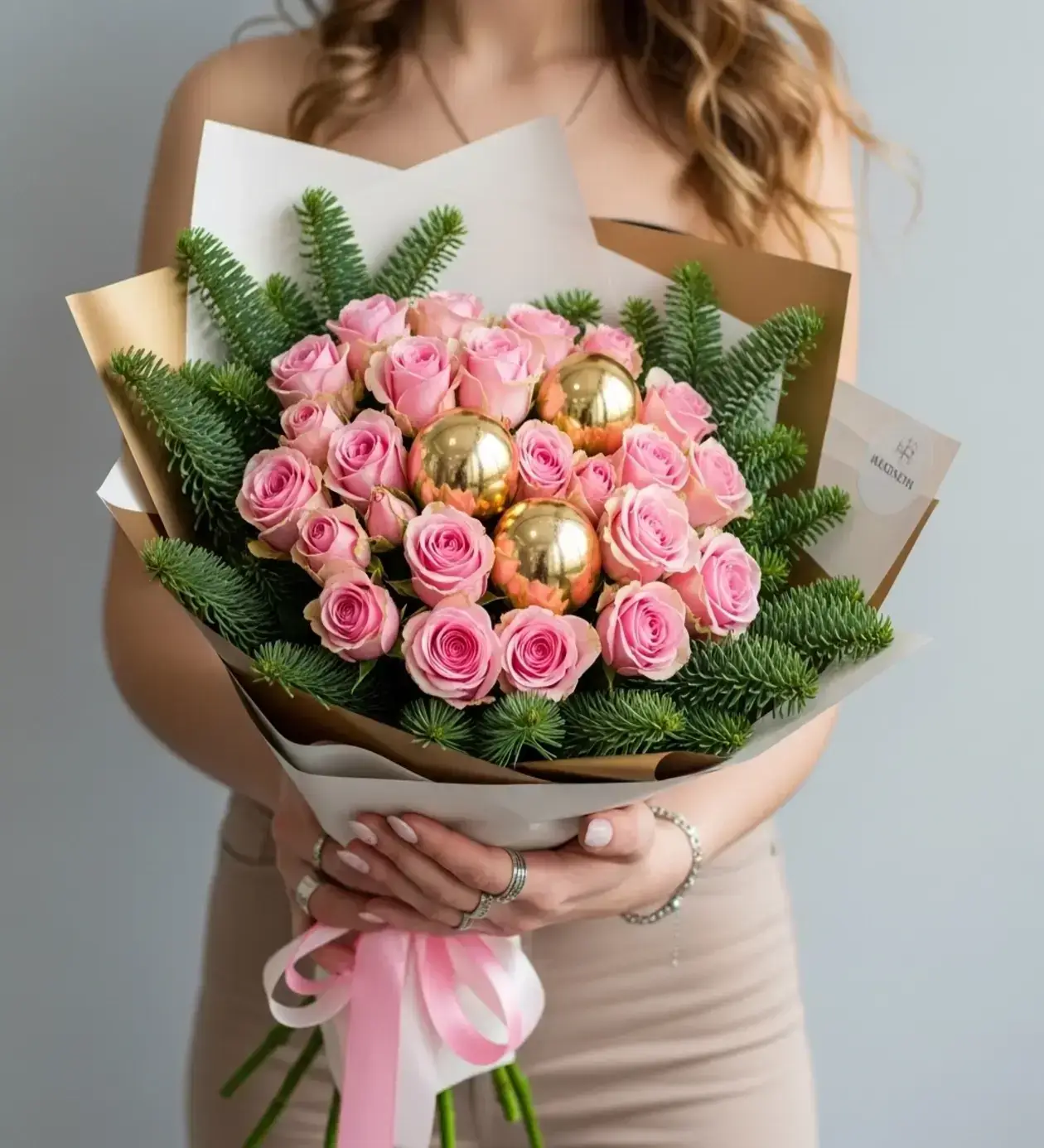 Kat kat krem–gold ambalajdan dışarı taşan yoğun çam dalları; ortasında kubbe formunda dizilmiş pudra pembe güllerle buluşuyor. Aralarına yerleştirilen gold yılbaşı topları, bukete şampanya ışıltısı katıyor ve tasarımı tek bakışta “premium” hissettiriyor. Alt kısımdaki pembe saten kurdele ise tüm bu şıklığı romantik bir hediye paketine dönüştürüyor.