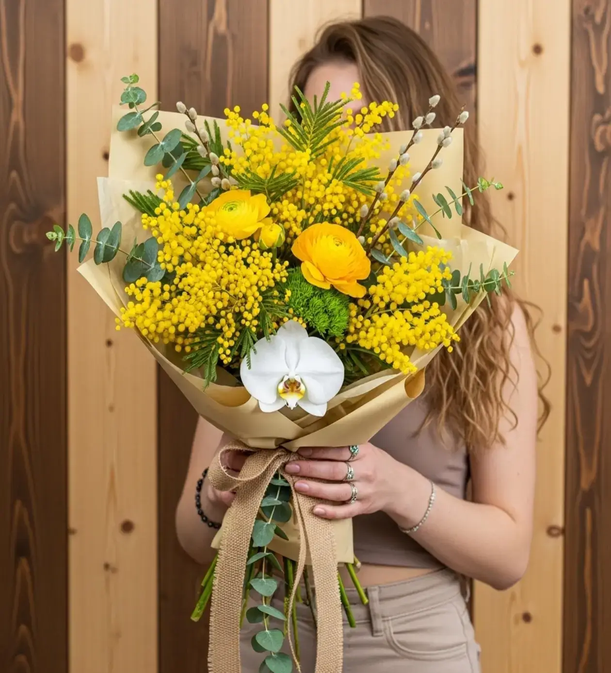 Bu rustik bukette; 8 Mart'ın simgesi mimozalar, kat kat yapraklarıyla büyüleyen sarı ranunculuslarla dans ediyor. Aralara serpiştirilen kedi söğüdü dalları (pussy willow) tasarıma nostaljik bir dokunuş katarken, merkezdeki beyaz orkide zarafeti simgeliyor. Kraft kağıt ambalajı ve hasır kurdelesiyle sunulan bu tasarım, yapaylıktan hoşlanmayan, "Toprak ve Doğa" aşığı kadınlar için en içten hediye.