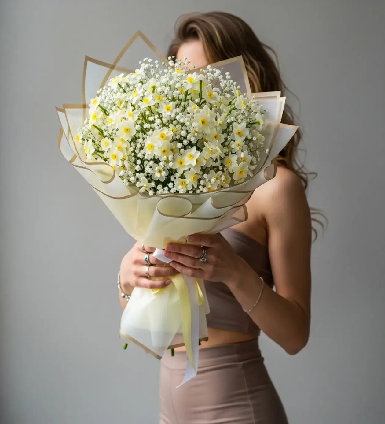 Bu özel tasarımda, nergislerin doğal güzelliğini gölgelemeyen ancak ona premium bir hava katan, kenarları gold şeritli özel ithal kağıtlar kullandık. Hem göze hem de koku duyusuna hitap eden bu buket, sıradan bir hediyeden çok daha fazlası.