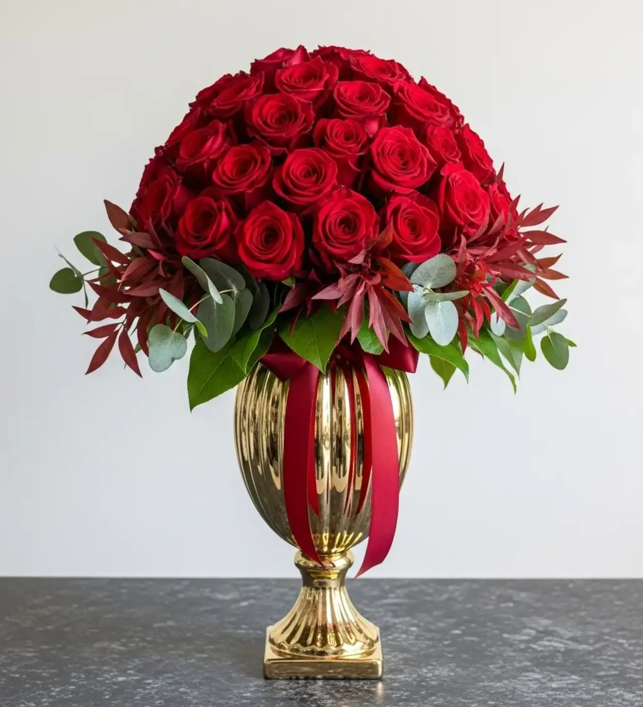 ✨ Altın vazonun ışıltısı, kırmızı güllerin büyüleyici güzelliğiyle birleşerek göz alıcı bir bütünlük yaratır. İster yıldönümü, ister doğum günü ya da sadece içinizden geldiği için; bu aranjman unutulmaz bir hediye olacaktır.
