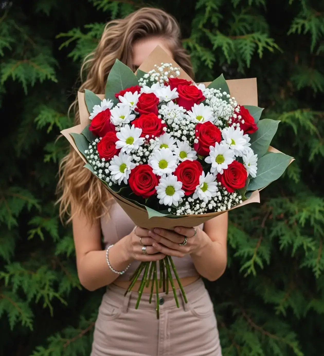 Bu özel tasarımda, aşkın değişmez sembolü kırmızı güller, doğallığın ve masumiyetin simgesi beyaz papatyalarla (krizantem) harmanlandı. Gösterişli ve parlak ambalajlar yerine tercih edilen doğal Kraft kağıt, bukete "Sanki kır bahçesinden senin için topladım" havası veriyor. İlişkinizdeki samimiyeti anlatmanın en güzel yolu.