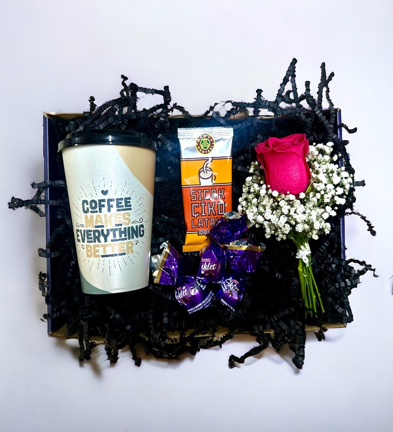 Ürünümüzün içerisinde 1 adet kırmızı gül, kahve bardağı, sıcak çikolata ve çikolata bulunmaktadır.