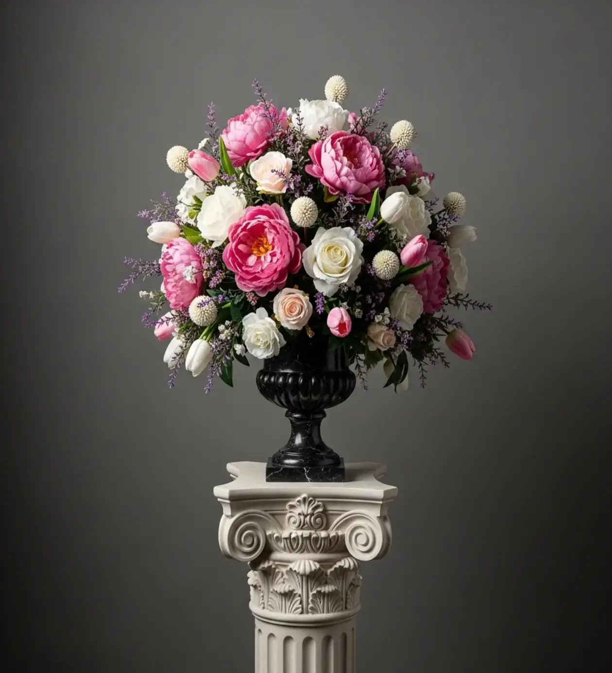 Tasarımın odak noktasında, çiçek kraliçesi olarak bilinen ve eşsiz katmanlarıyla göz kamaştıran devasa pembe şakayıklar (peony) yer alıyor. Şakayıkların o yumuşak ve romantik duruşu, klasik beyaz güller ve zarif lalelerle desteklenerek kusursuz bir kubbe (dome) formu oluşturuyor. Aranjmanı asıl sanatsal boyuta taşıyan unsur ise, bu pastel renk cümbüşünü inanılmaz bir derinlikle patlatan siyah antik kupa vazodur. Siyahın ağırlığı ve pembenin romantizmi, girdiği her mekanı lüks bir saray odasına dönüştürür.