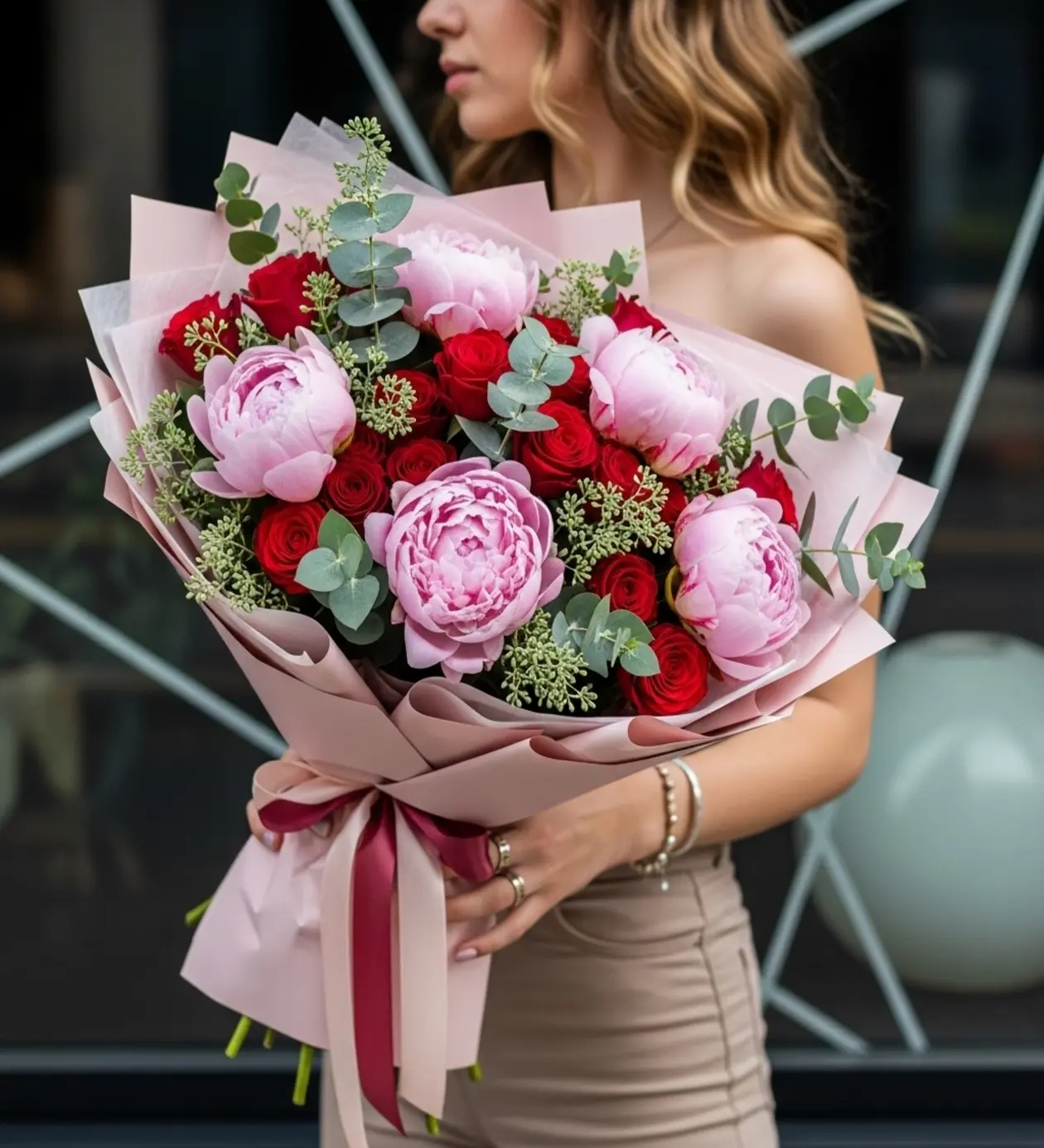 Şakayıkların kat kat açılan, ipeksi ve dolgun yapısı, kırmızı güllerin kadifemsi dokusuyla mükemmel bir kontrast oluşturuyor. Bu buket, "Seni seviyorum" demenin en lüks ve zarif yolu. Pudra pembesi özel ithal kağıtla sarılan ve bordo saten kurdeleyle tamamlanan bu tasarım, eline alan herkesi kendine hayran bırakacak.