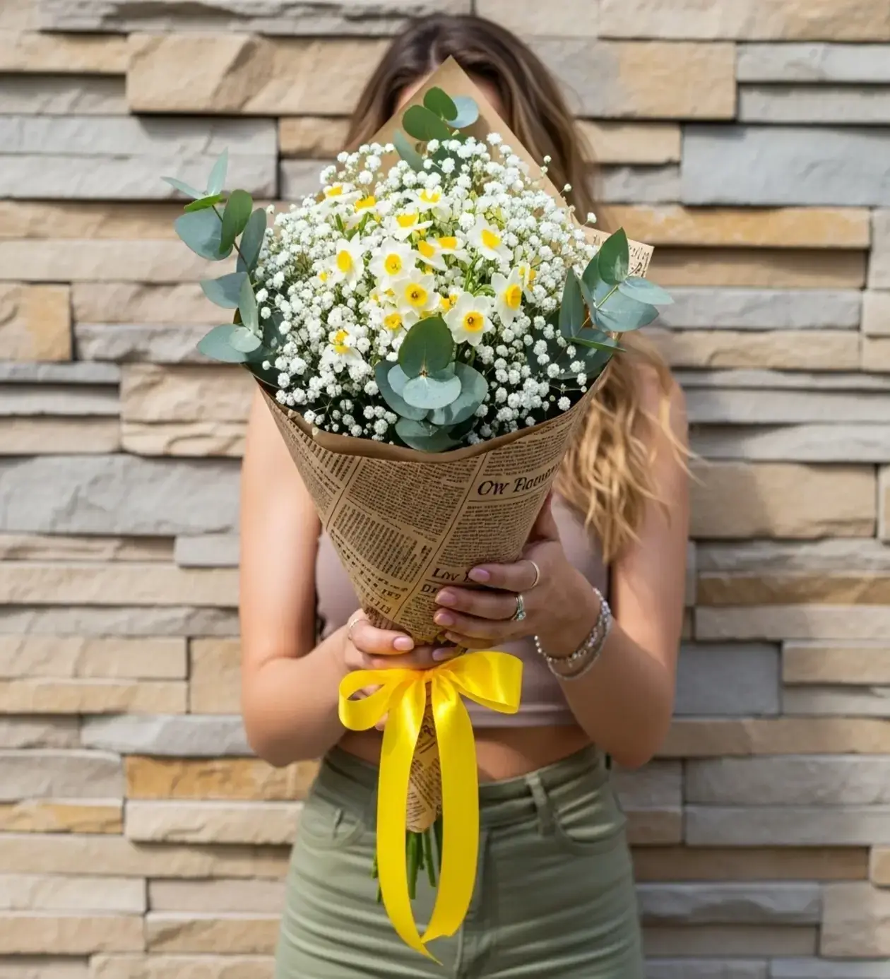 Mis kokulu nergisleri ve onları çevreleyen beyaz cipso çiçeklerini, gazete desenli özel kraft kağıt ile sarmalayarak o çok sevilen "Vintage" havasını yakaladık. Buketin üzerindeki parlak sarı kurdele ise tasarıma güneş gibi bir enerji katıyor. İçerisindeki okaliptüs dalları, bukete hem hacim hem de modern bir doku kazandırıyor.