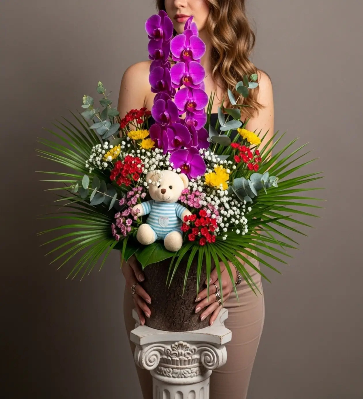 Canlı mor Phalaenopsis orkide, asaletin simgesi olarak dikkat çekerken, renkli mini karanfiller, papatyalar ve gypso çiçekleri aranjmana canlılık katar.