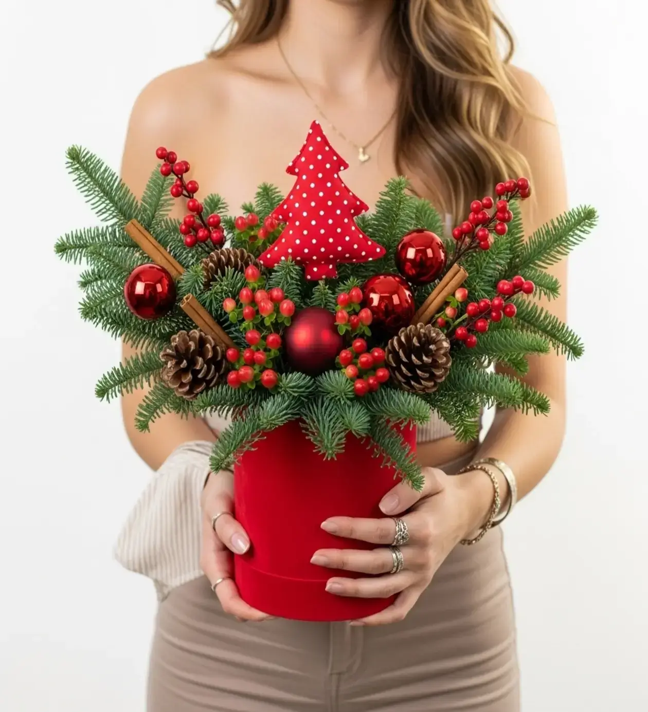 Tamamen yılbaşı ruhu için tasarlanan Kırmızı Yılbaşı Ağacı Aranjmanı, modern ve sıcak görüntüsüyle bulunduğu her ortamı bir anda yeni yıl köşesine çevirir.