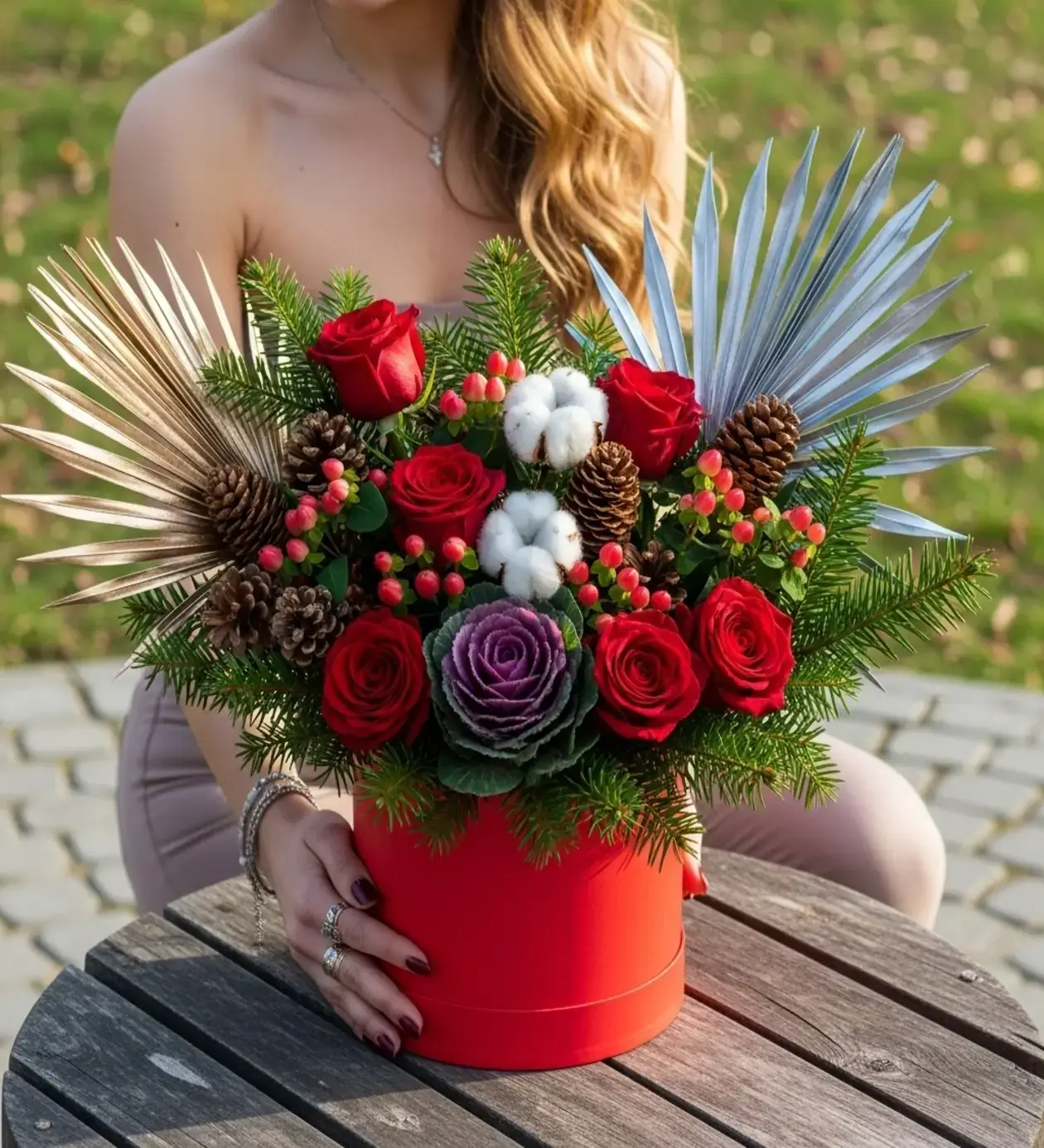 Kırmızı Kutu Kış Bahçesi – Kozalaklı Yılbaşı Aranjmanı tam senin enerjin.