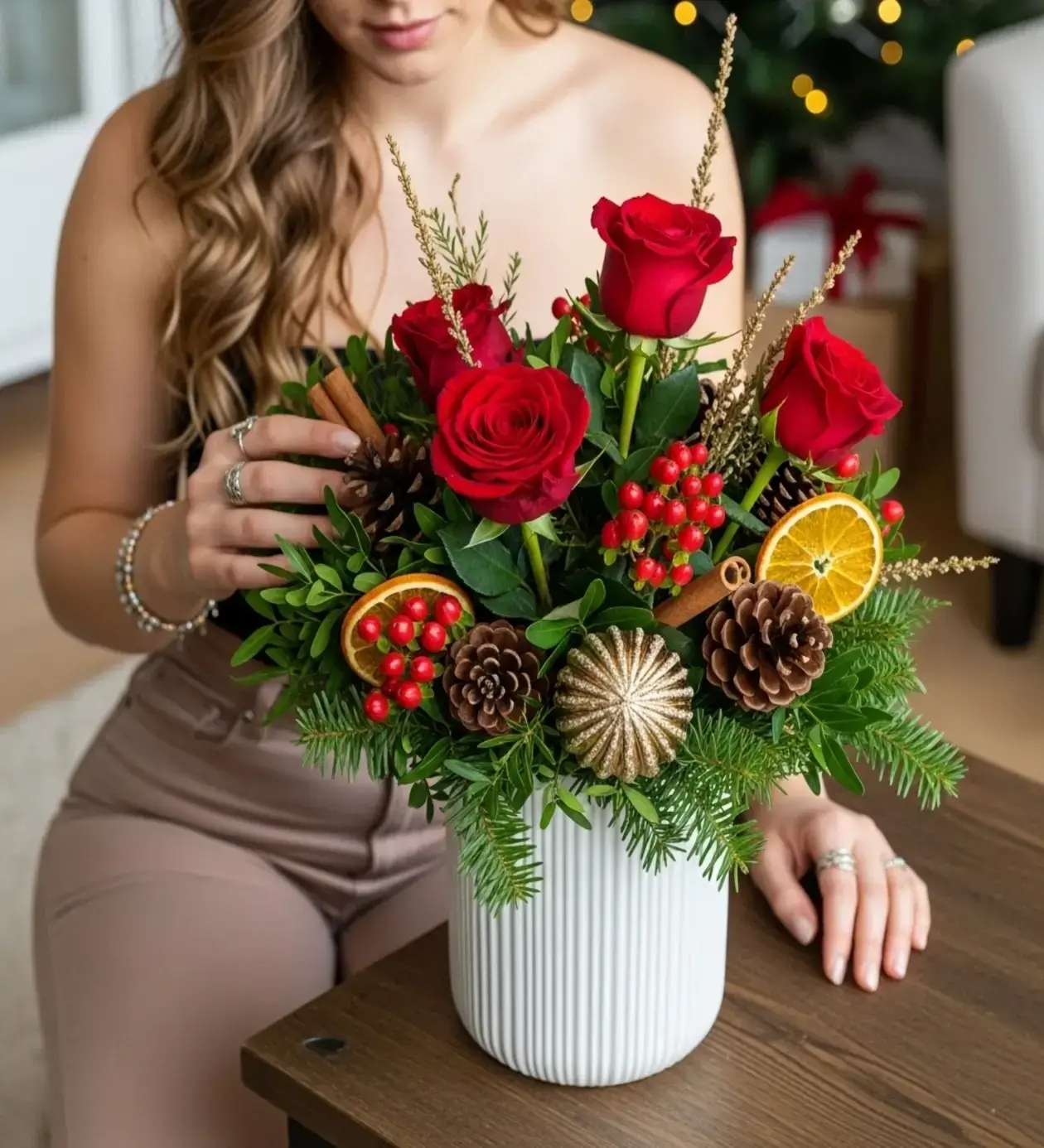 Beyaz, modern seramik vazonun içinden; kadifemsi kırmızı güller, parlak kırmızı kokina taneleri, çam yeşillikleri, kuru portakal dilimleri, tarçın çubukları ve kozalaklar yükseliyor. Aralara yerleştirilen gold detaylar aranjmana sıcak, ışığı yakalayan bir ışıltı katıyor. Ortamda mumlar yandığında, bu kokinalı yılbaşı çiçeği masanın en çok konuşulan parçasına dönüşüyor.